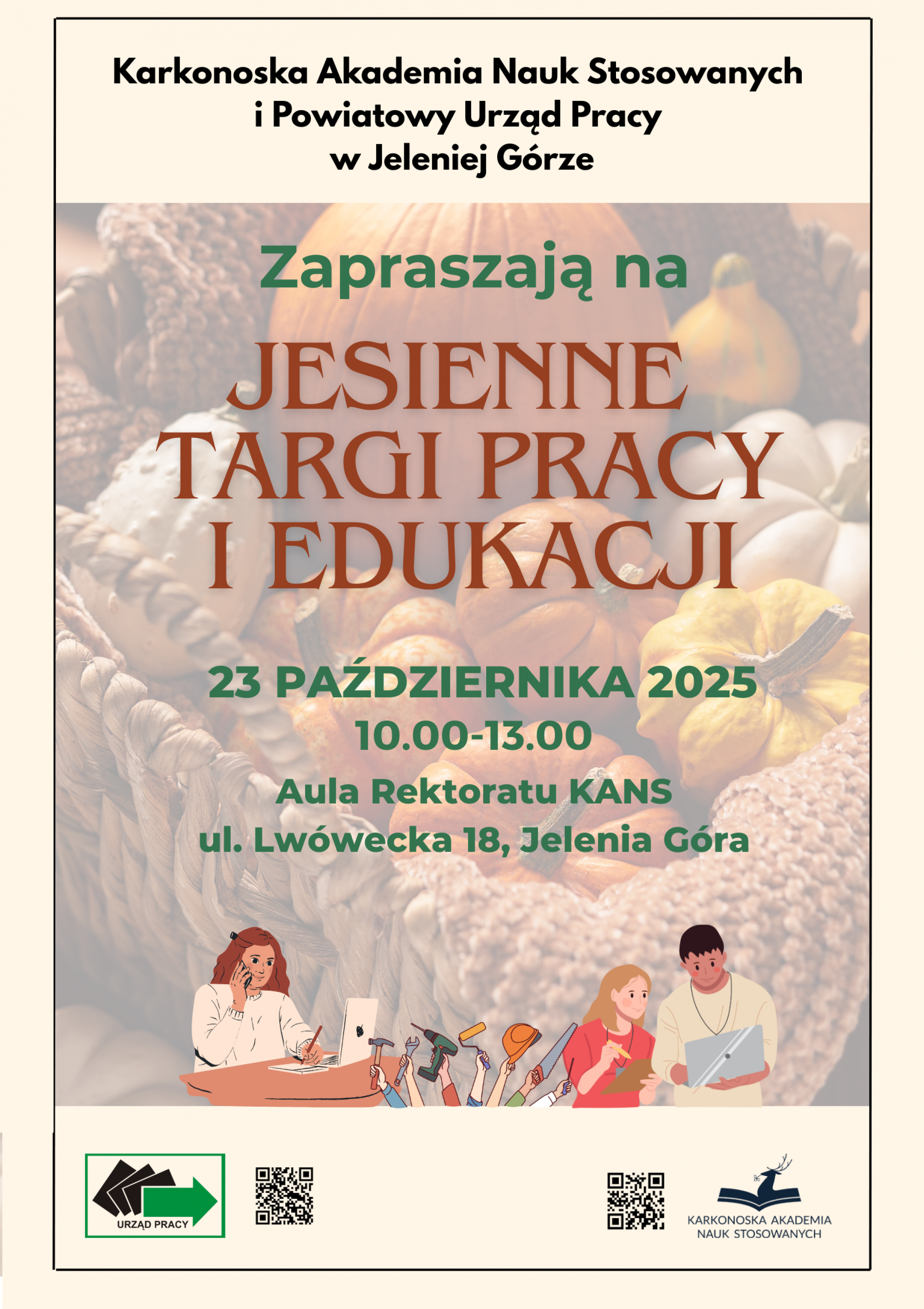 Karkonoska Akademia Nauk Stosowanych w Jeleniej Górze oraz Powiatowy Urząd Pracy w Jeleniej Górze zapraszają na Jesienne Targi Pracy i Edukacji, które odbędą się 23 października 2025 r. w godz. 10:00–13:00 w Auli Rektoratu KANS (ul. Lwówecka 18, Jelenia Góra).