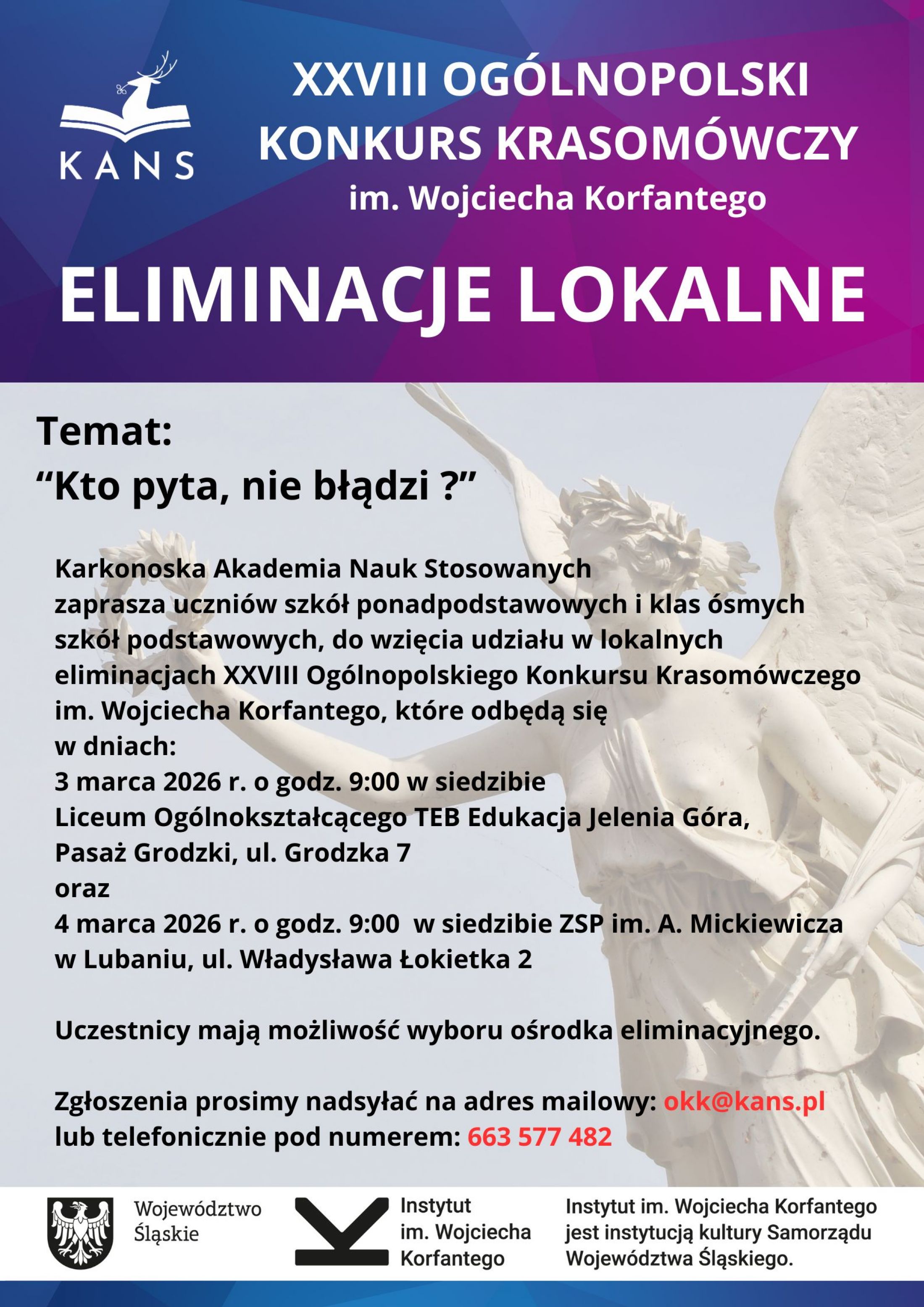 Już po raz trzeci Karkonoska Akademia Nauk Stosowanych w Jeleniej Górze dołączyła do organizatorów Ogólnopolskiego Konkursu Krasomówczego im. Wojciecha Korfantego dla uczniów szkół ponadpodstawowych i klas ósmych szkół podstawowych. Nasza uczelnia odpowiada za przeprowadzenie eliminacji lokalnych i regionalnych. Organizatorem finału konkursu jest Instytut Myśli Polskiej im. Wojciecha Korfantego. W tym roku odbędzie się już XXVIII edycja konkursu.