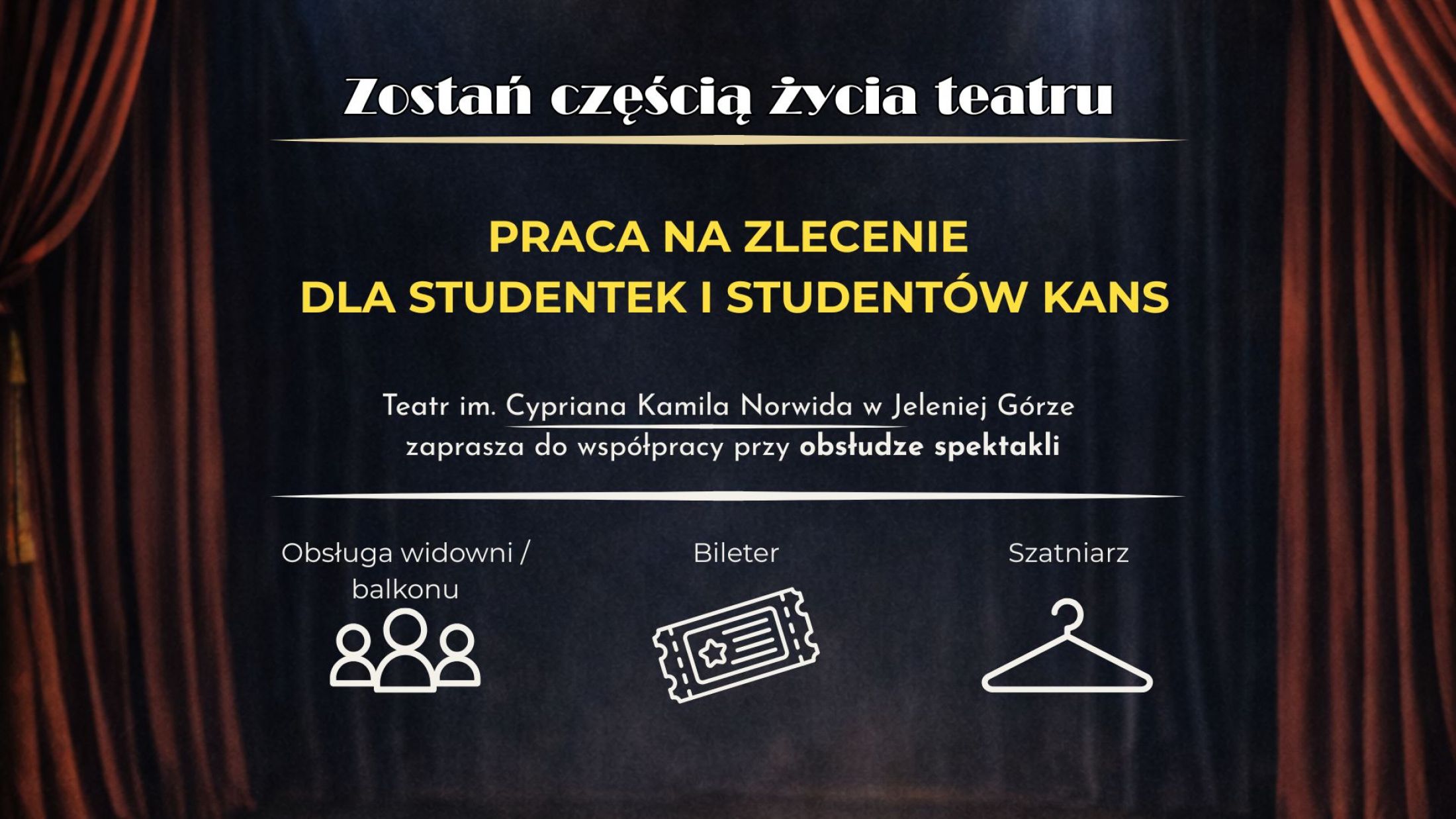 Teatr im. Cypriana Kamila Norwida w Jeleniej Górze zaprasza studentki i studentów Karkonoskiej Akademii Nauk Stosowanych do współpracy przy obsłudze spektakli.