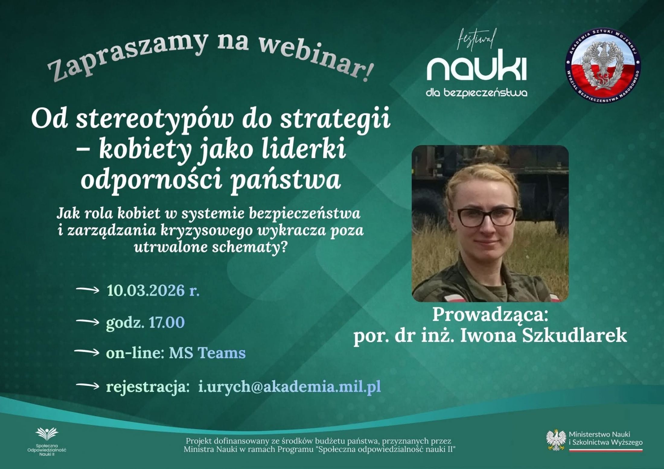 Już 10 marca 2026 r. o godz. 17.00 odbędzie się otwarty webinar pt. „Od stereotypów do strategii – kobiety jako liderki odporności państwa”, realizowany w ramach Festiwalu Nauki dla Bezpieczeństwa. Wydarzenie odbędzie się w formule online na platformie MS Teams.