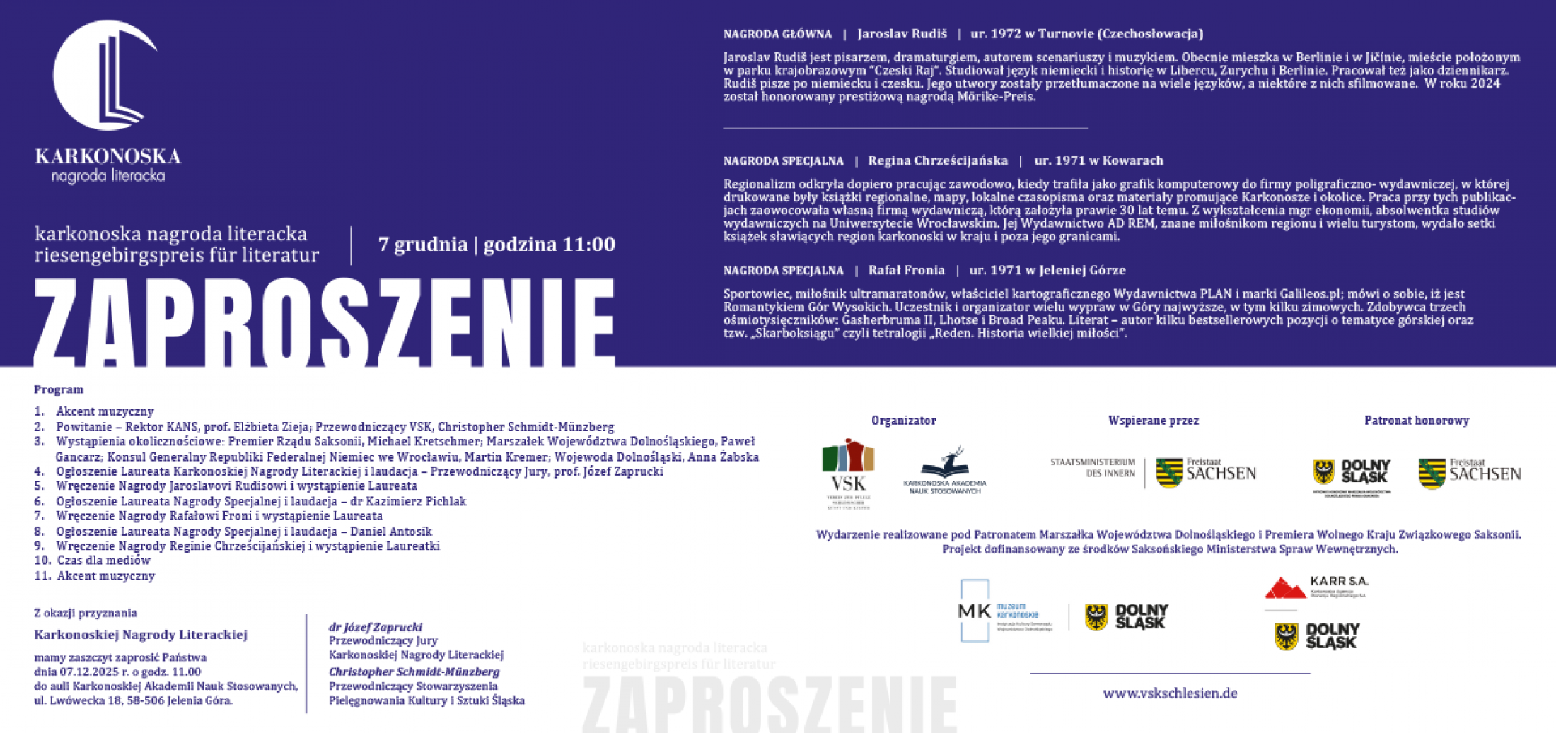 Mamy zaszczyt poinformować, że 7 grudnia 2025 roku o godz. 11:00 w auli Karkonoskiej Akademii Nauk Stosowanych w Jeleniej Górze odbędzie się uroczyste wręczenie Karkonoskiej Nagrody Literackiej. Organizatorem wydarzenia jest Stowarzyszenie Pielęgnowania Kultury i Sztuki Śląska (VSK, niem. Verein zur Pflege schlesischer Kunst und Kultur e.V.), we współpracy z Karkonoską Akademią Nauk Stosowanych, Muzeum Karkonoskim i Karkonoską Agencją Rozwoju Regionalnego. Nagroda jest realizowana pod patronatem Marszałka Województwa Dolnośląskiego oraz Premiera Wolnego Kraju Związkowego Saksonii.