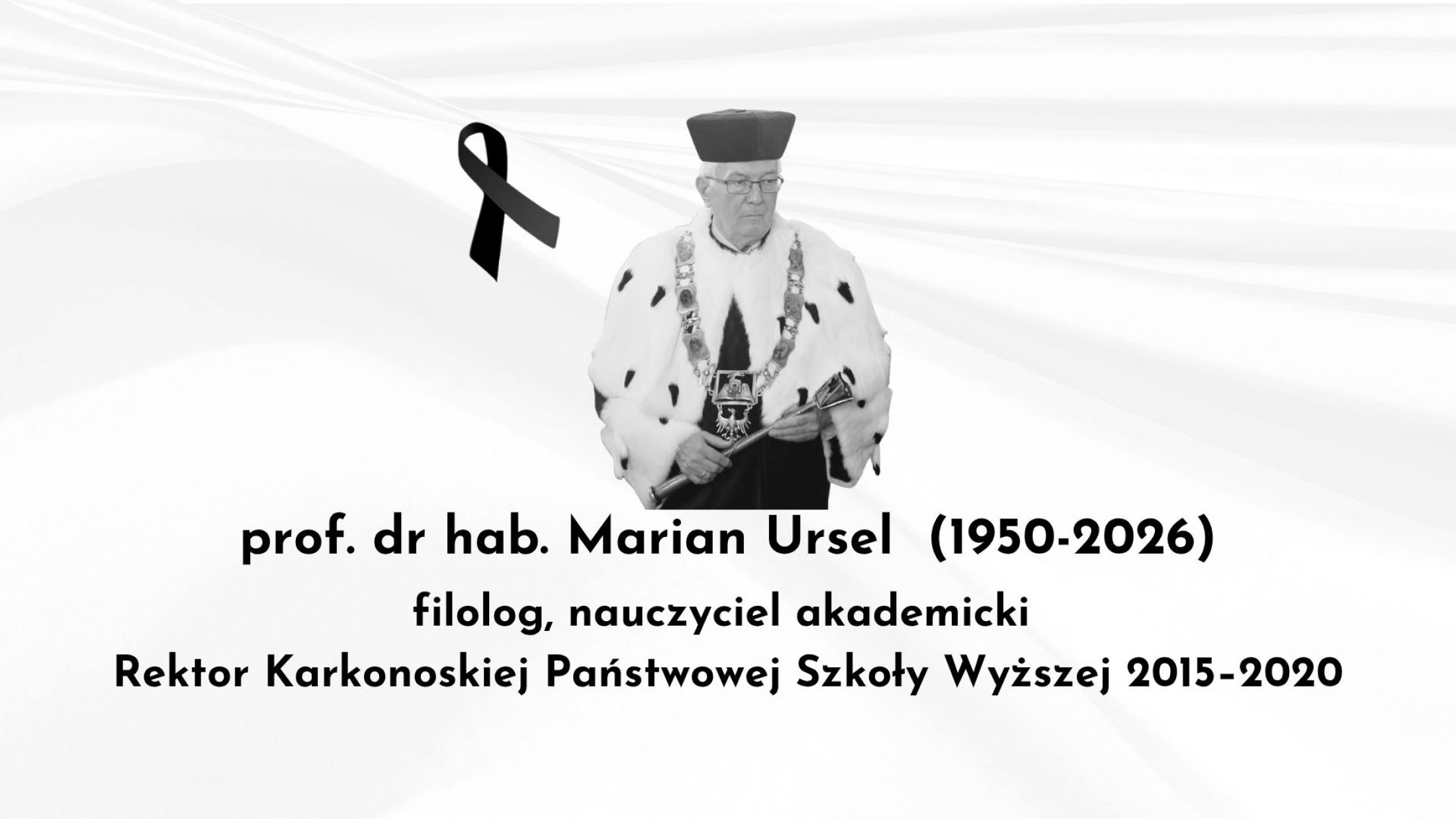 Z głębokim smutkiem i żalem przyjęliśmy wiadomość, że 6 kwietnia 2026 roku zmarł śp. prof. dr hab. Marian Ursel (1950–2026) – wybitny filolog, historyk literatury romantyzmu, znawca twórczości Aleksandra Fredry, Rektor Karkonoskiej Państwowej Szkoły Wyższej w latach 2015–2020 oraz wieloletni wykładowca w Zakładzie Dziennikarstwa i Komunikacji Społecznej Wydziału Nauk Humanistycznych i Społecznych naszej Uczelni.